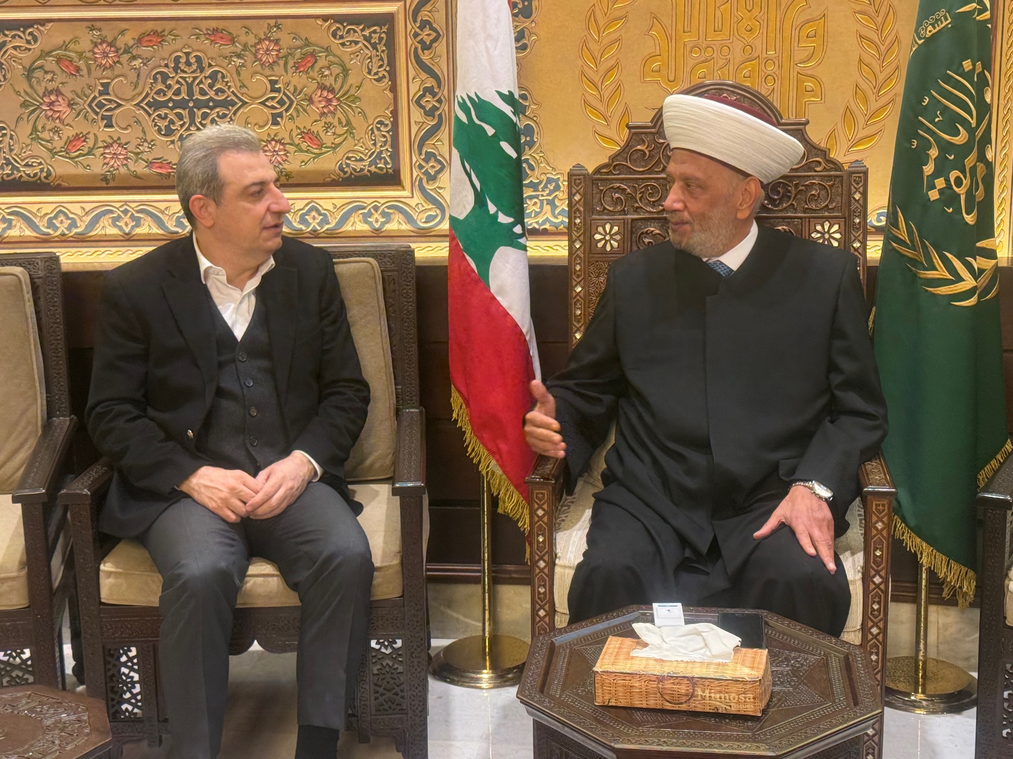 استقبل مفتي الجمهورية اللبنانية الشيخ عبد اللطيف دريان في دار الفتوى النائب وائل أبو فاعور الذي قال بعد اللقاء: تشرفت بلقاء سماحته وهي زيارة دورية نحرص على القيام بها بالوقوف دائماً على رأيه وعلى موقفه من كل التطورات في كل الإستحقاقات الوطنية وهي فرصة للإستفادة من حكمته ومعرفته ووطنيته، وبالتأكيد الوضع إذا أردنا وصفه هو حالة من القلق الوطني نتيجة ما يحدث من ازدياد المخاطر على المستوى الوطني ونرى الإعتداءات الإسرائيلية التي لا توفر أي منطقة من لبنان والمستوى الإقليمي فيما يحكى عن مواجهات كبرى والمستوى الدولي فيما نراه على المسرح الدولي والمنطق الطبيعي حول هذه المخاطر أن تتثقف الحكمة اللبنانية عن البحث عن مقاربة وطنية مشتركة وربما الحديث عن الوحدة الوطنية أو طموح كبير او الحد الأدنى الوصول لمقاربات وطنية مشتركة للتعاون حول هذه المخاطر تحت سقف الدولة الجامعة والعادلة والتي تعنى بجميع مواطنيها، والدولة التي لا يقاسمها أي طرف اي من صلاحياتها ومسؤولياتها الأساسية أو السيادية، ونأمل أن يكون العام الجديد عام تتوحد فيه الإرادات الوطنية في المؤسسات الدستورية كان على المستوى السياسي أو الاقتصادي أو العلاجات الاجتماعية.